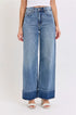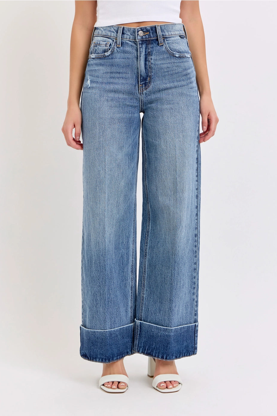 The Gia Wide Cuff jeans combine a flattering high-rise fit with wide-leg comfort, crafted from medium denim for versatile style. Featuring classic five-pocket detailing and a secure zipper fly, these jeans offer both practicality and a modern silhouette that elevates any outfit effortlessly. Perfect for those seeking a blend of comfort and chic edge.