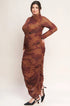 The Kaia Contour Midi Dress is a striking printed power mesh piece that celebrates fluid movement and sculptural silhouette. The tubular neckline frames the shoulders with understated elegance, while long sleeves provide graceful coverage. Strategic side and back shirring creates dimensional contouring that flatters the form, and a discreet back zipper ensures an effortless fit. Perfect for those seeking a dress that balances edgy sophistication with free-spirited style.