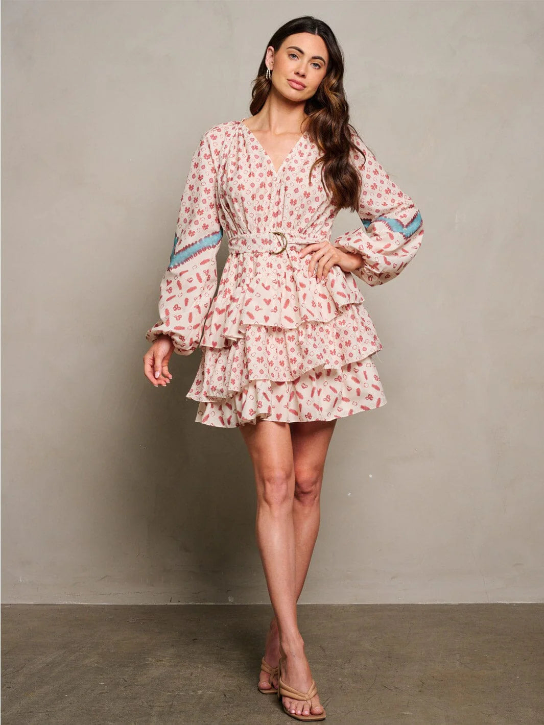 This bohemian-inspired mini dress features long sleeves, a flattering V-neck, and elegant ruffle tiers. The vibrant, multi-print design adds a touch of whimsy to your wardrobe. Perfect for any occasion, this dress will make you feel like a free-spirited fashionista.