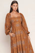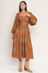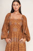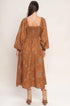 The Sonora Sands Midi Dress captures effortless desert-inspired elegance with its printed woven fabric and thoughtfully crafted details. The square neckline frames the shoulders beautifully, while long sleeves finished with smocked cuffs add a touch of vintage charm. A flowing full skirt moves gracefully with every step, complemented by a smocked back bodice that creates subtle texture and dimension. Perfect for layered styling or worn alone, this midi dress embodies free-spirited sophistication for those who embrace bohemian aesthetics.