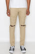 Classic zip fly closure Button closure Distressed knee Backing under distressed Slim fit Five pocket design